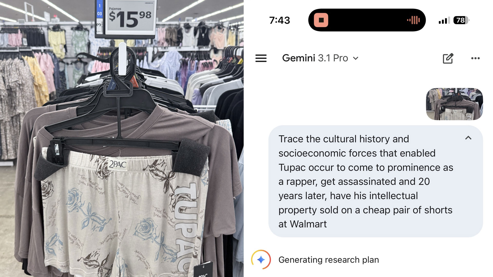 The question — typed into Gemini 3.1 Pro in roughly the time it takes to tie a shoe — was whether a sixteen-page research document could metabolize this artifact into something useful. Late-stage capitalism. The commodification of Black revolutionary aesthetics. The legal architecture of the Shakur estate. The supply chain that moves a dead poet’s metaphor across an ocean and onto a polyester-cotton blend. Sixteen pages, then a Michael Lewis longform. Sixteen pages, then a 9×16 infographic. Sixteen pages, then a thread.